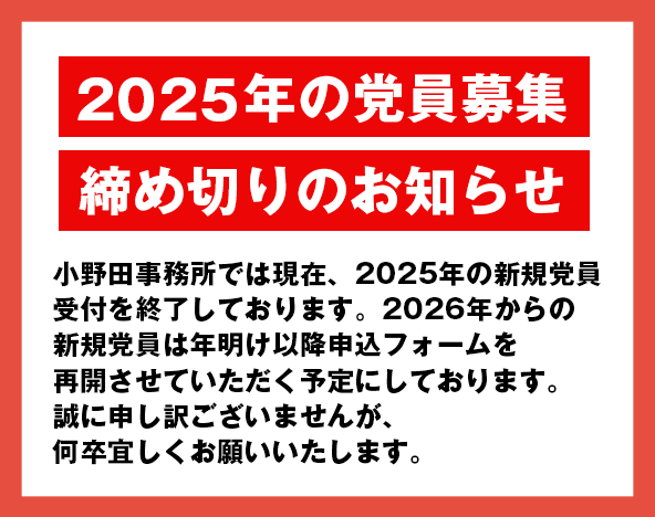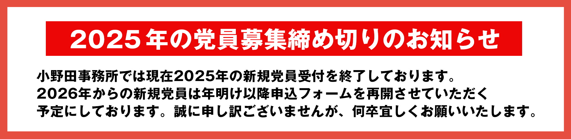 ※現在党員の方で他事務所から小野田事務所へ移籍(継続)の場合は、現在所属している事務所または県連にご連絡をお願いいたします。